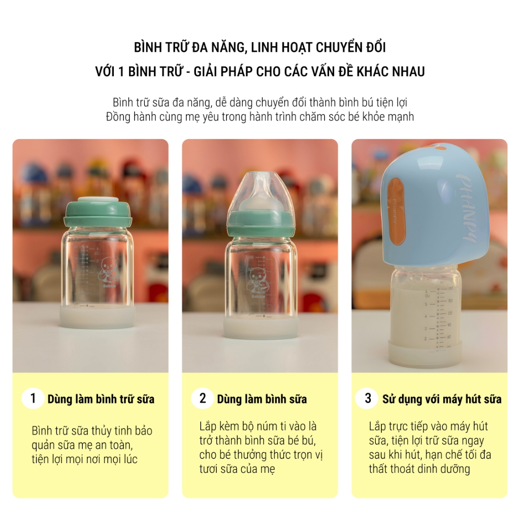 Dung tích: 150ml (cổ hẹp, tương thích Medela), 180ml (cổ rộng)