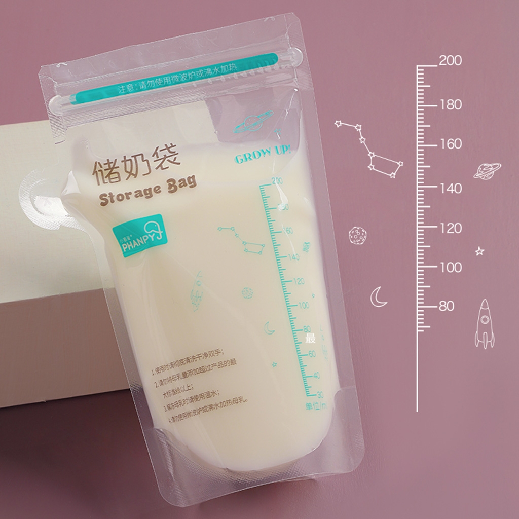 Bịch đựng sữa 200ml Phanpy thiết kế túi 2 lớp, tăng tính cản khí, không trần trí, chống vỡ đổ, khóa chắc chắn, trữ chặt, ăn toàn không tràn sữa.